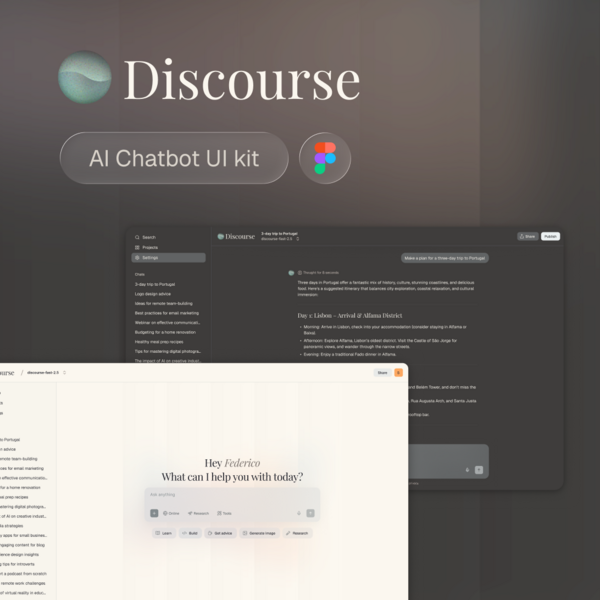Discourse is a premium UI kit designed for modern AI chatbot products like ChatGPT, Claude, Gemini, and custom AI wrappers. Built to capture the essence of conversational AI interfaces, Discourse delivers a polished, professional design system that feels warm and human. With its clean aesthetic and thoughtful interaction patterns, this kit provides everything you need to build a world-class chat experience.